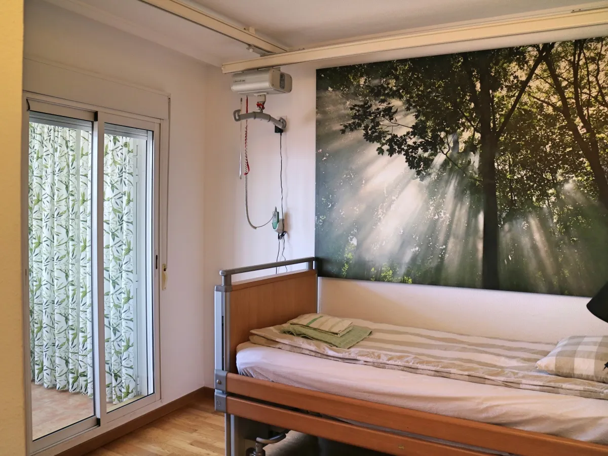 Ett enkelrum med en höj- och sänkbar säng. Mobillyft. Utgång till altanen.